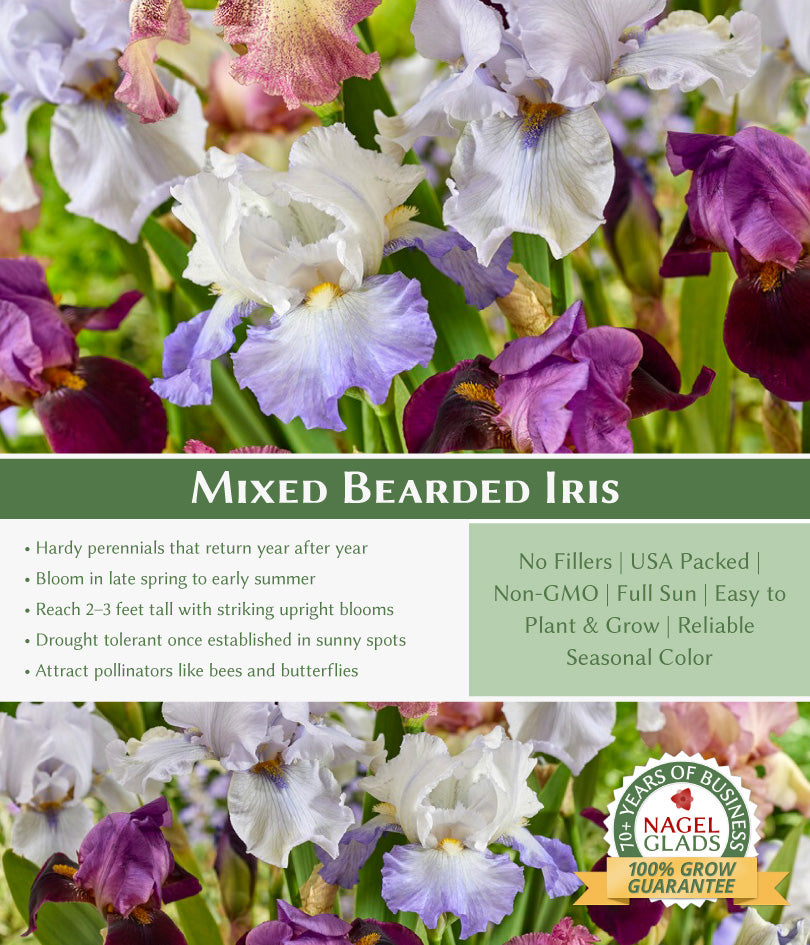 Make a bold and elegant statement in your late spring garden with this colorful collection of Mixed Bearded Iris. Each plant produces large, ruffled blooms in a blend of rich burgundy, soft lavender, creamy white, pastel peach, and pale blue. The distinctive ""beard"" at the center of each flower adds texture and charm, making these irises a favorite for both classic and cottage-style gardens.