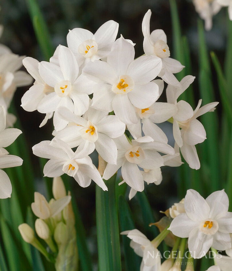 Enjoy the sweet scent of spring indoors or out with Ziva Paperwhites, a beloved variety of indoor-forcing narcissus. These elegant blooms feature clusters of pure white star-shaped flowers with golden centers, rising above narrow green foliage. Known for their quick bloom time and strong fragrance, Ziva Paperwhites are a favorite for winter windowsills, holiday centerpieces, and early spring gardens.